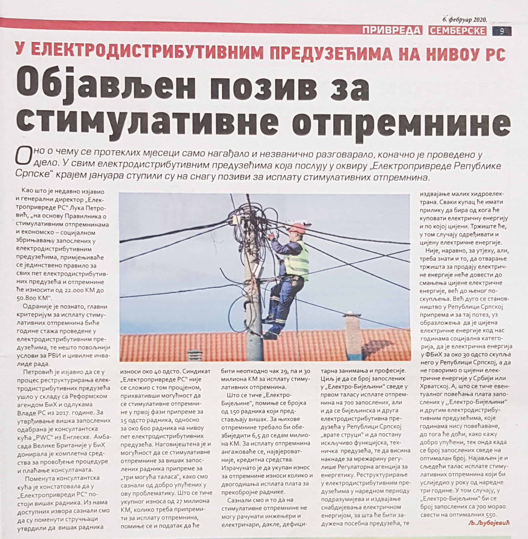 Тридесетпрвог јануара, у пет дистрибутивних предузећа Електропривреде Српске, биће отворен позив и познати услови за пријаву на стимулативне отпремине вишка запослених. Ријеч је о првом кругу, у коме су износи отпремнина највећи.