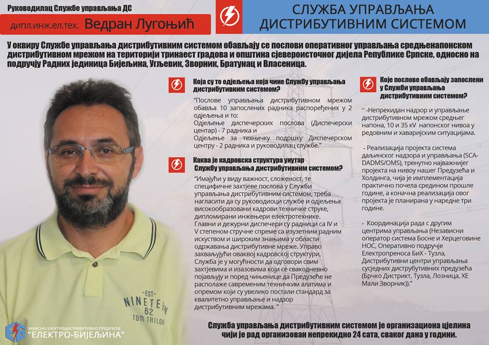 У оквиру Службе управљања дистрибутивним системом обављају се послови оперативног управљања средњенапонском дистрибутивном мрежом на територији тринаест градова и општина сјевероисточног дијела Републике Српске, односно на подручју Радних јединица Бијељина, Угљевик, Зворник, Братунац и Власеница.