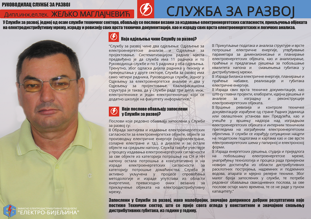 У Служби за развој, једној од осам служби техничког сектора, обављају се послови везани за издавање електроенергетских сагласности, прикључења објеката на електродистрибутивну мрежу, израду и ревизију свих врста техничке документације, као и израду свих врста електроенергетских и логичких анализа.