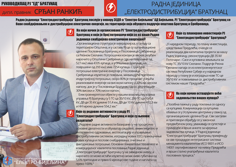 Радна јединица “Електродистрибуција” Братунац послује у оквиру ЗЕДП-а “Електро-Бијељина” АД Бијељина. РЈ “Електродистрибуција” Братунац се бави снабдијевањем и дистрибуцијом електричне енергије, на територији која обухвата подручје општинa Братунац и Сребреница.