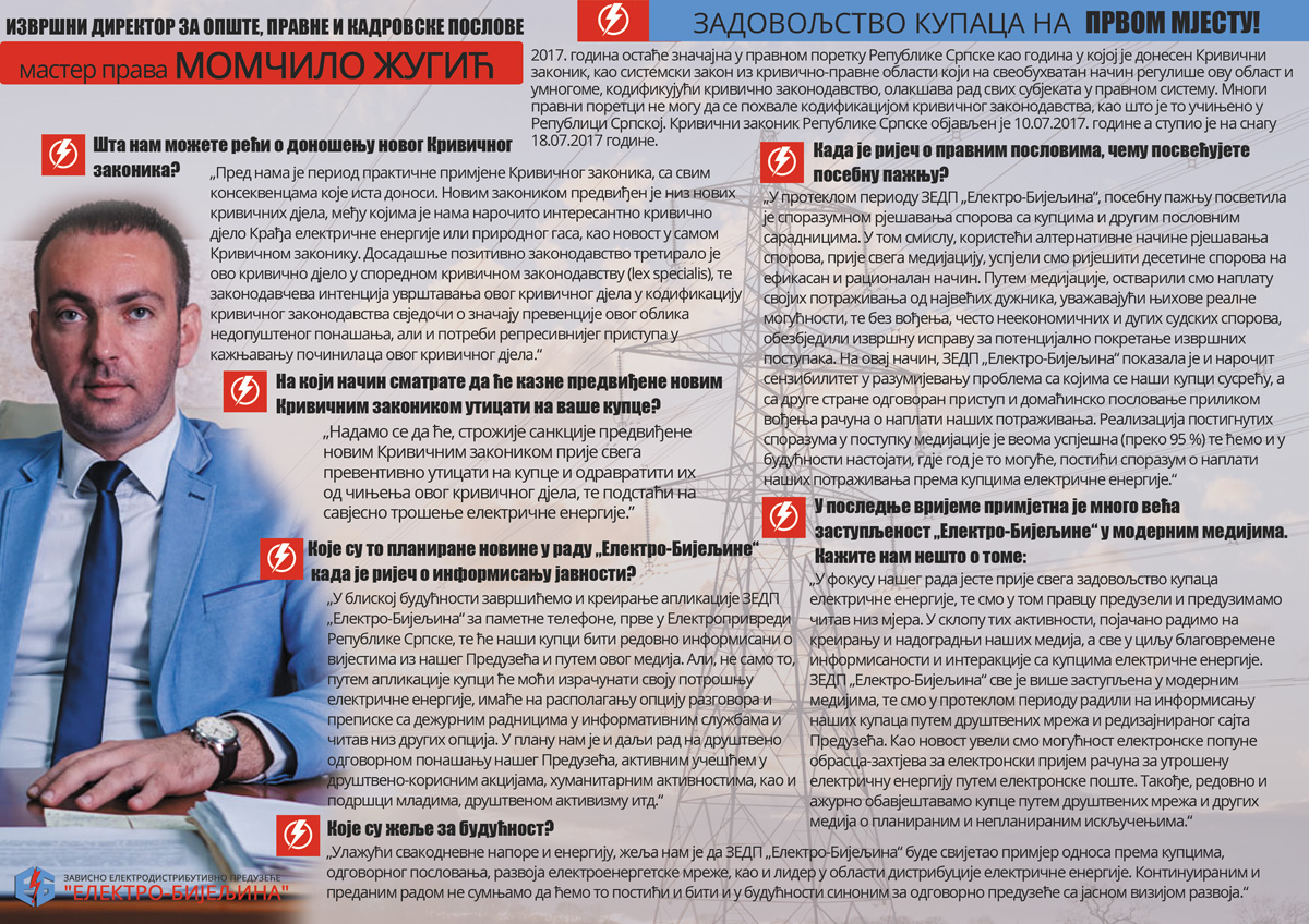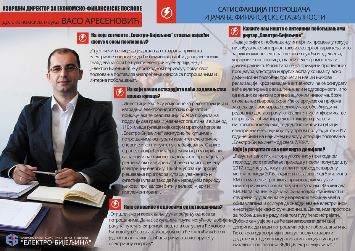 „Свјесни чињенице да је дошло до отварања тржишта електричне енергије и да ће неминовно доћи до појаве нових снабдјевача који ће нудити електричну енергију, ЗЕДП „Електро-Бијељина“ је у претходном периоду у фокус свог пословања поставила унапређење односа са потрошачима и интерна побољшања“.
